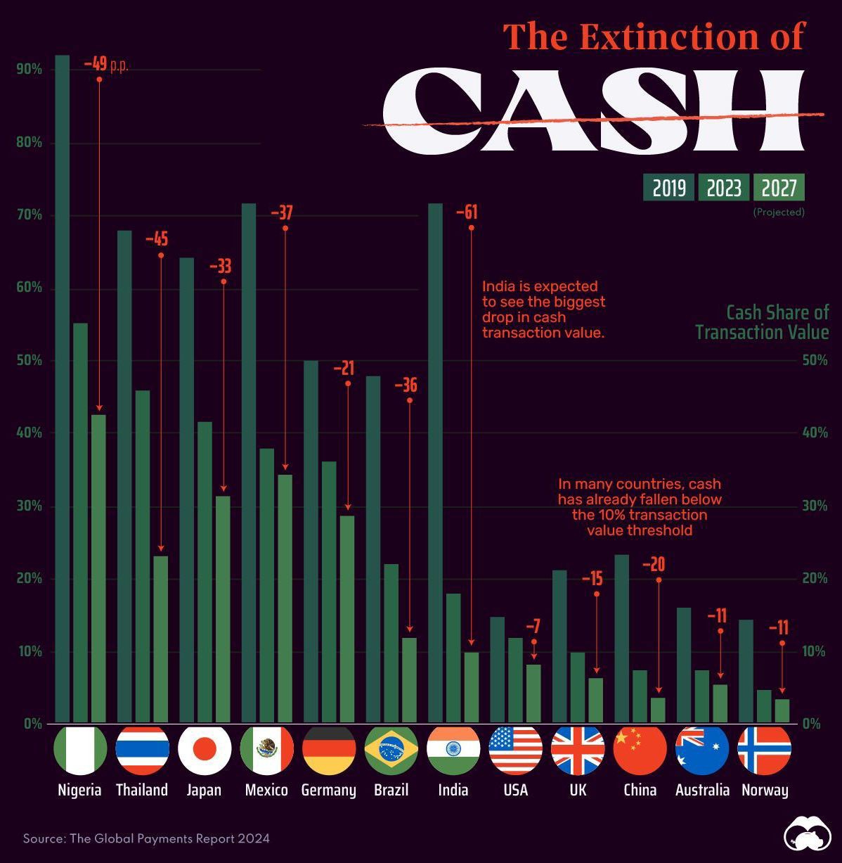 ๐ต The Global Decline of Cash: Opportunities for Fintech Startups โก๏ธ Recent data from WorldPayโs Global Payments Report 2024 reveals a significant shift in global payment trends, with cash transactions declining rapidly worldwide. This trend present