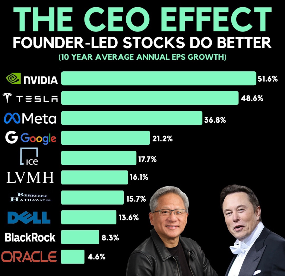 A Harvard study shows founder-led companies have a much better stock performance compared to stocks led by a CEO without relation to its founding. Their data showed 10 year average annual EPS growth in the following order: Nvidia: 51.6% Tesla: 48.6