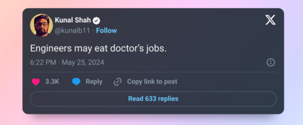 CRED CEO Says "Engineers May Eat Doctor's Jobs", Triggers Debate On X Kunal Shah, CEO of CRED, sparked debate with his statement, "Engineers may eat doctor's jobs." As technology reshapes industries, Shah hints at a future where engineers, driven by