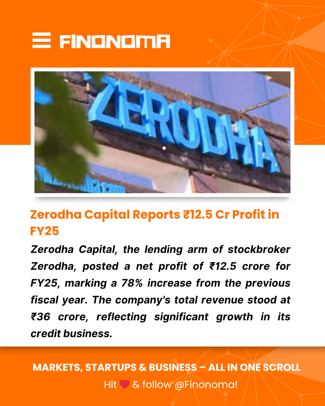 📈 Zerodha Capital Achieves ₹12.5 Cr Profit in FY25 Zerodha Capital, the non-banking financial company (NBFC) subsidiary of leading stockbroker Zerodha, has reported a net profit of ₹12.5 crore for the fiscal year ending March 2025. This represents