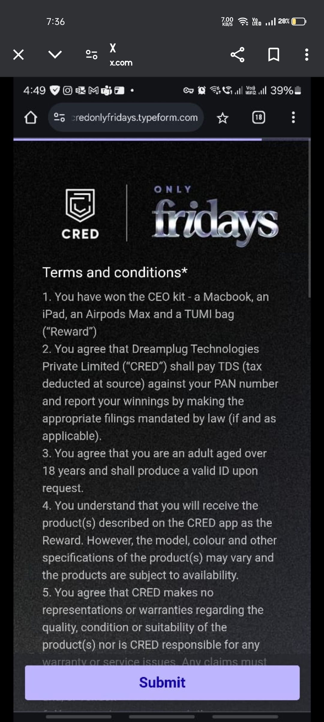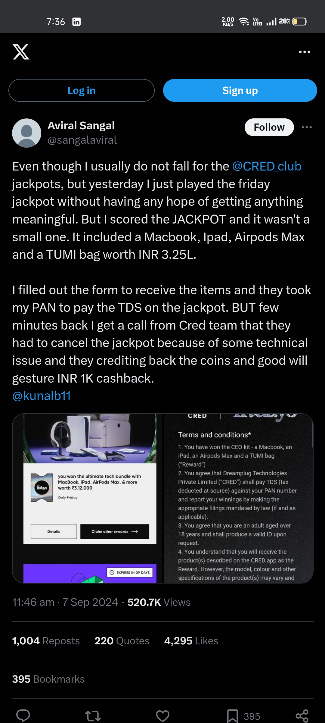 Cred Technical Glitch ๐ฅ A man played CREDโs Friday jackpot and won a MacBook, iPad, AirPods Max and a TUMI bag worth Rs 3.25 lakh. The company asked him to fill in his PAN details so that the TDS on the jackpot can be paid. But his happiness was