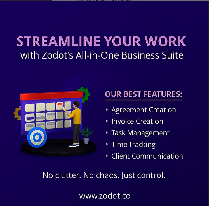 Work smarter, not harder. From tracking time to closing deals โ Zodot keeps everything in sync so you donโt have to juggle tools. ๐ผโก โ Create agreements โ Send invoices โ Manage tasks โ Track time โ Communicate with clients โ all in one place. ๐
