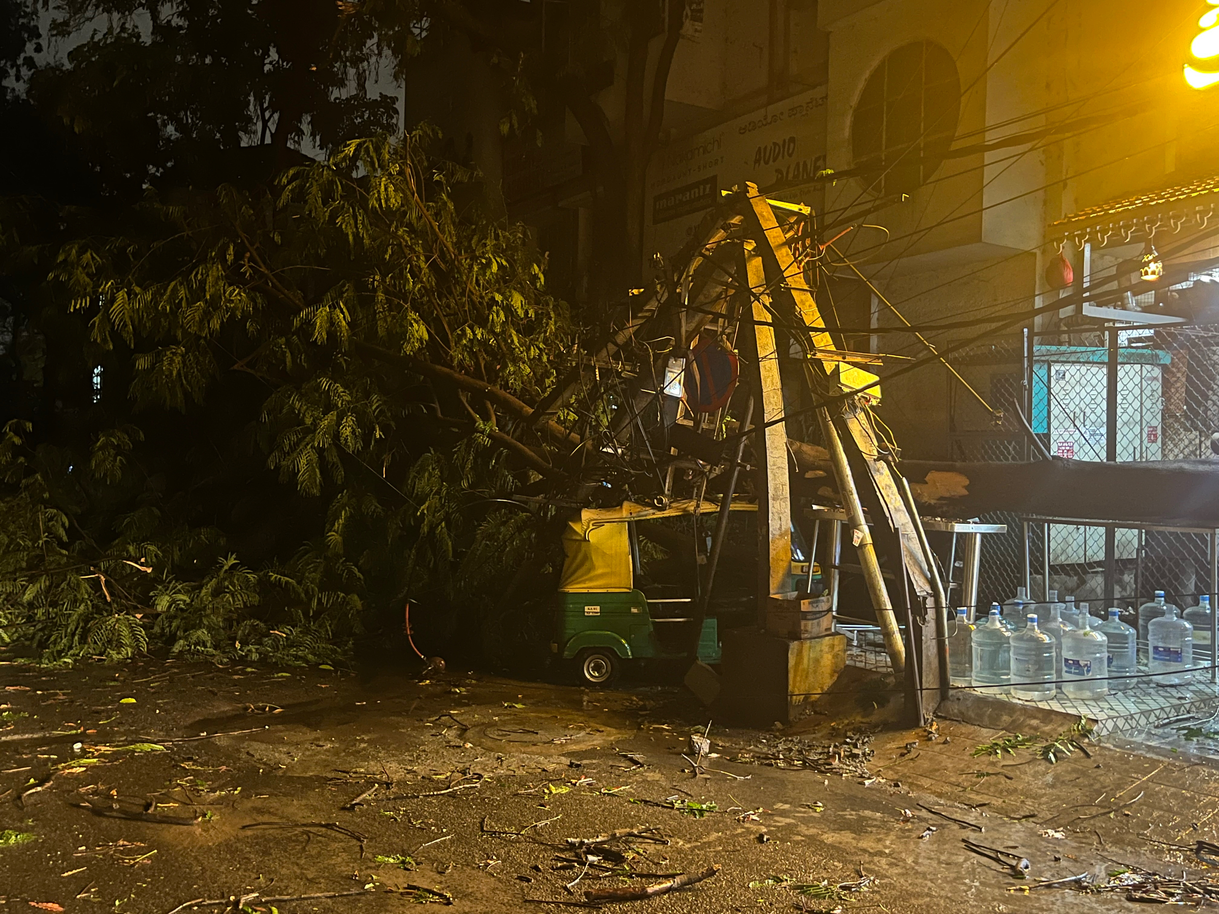 When I was travelling to office today I saw multiple roads blocked in Bangalore due to trees which had fallen yesterday and ended up blocking routes. Entire electric posts got uprooted or fell with a mess of wiring on the roads. Water-clogging is als