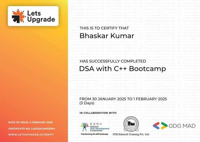 I'm excited to share that I've successfully completed the DSA with C++ Bootcamp! ๐๐ป **Course Details:** - Duration: 3 Days (30 January 2025 - 1 February 2025) - Collaboration: ITM Edutech Training Pvt. Ltd. This intensive bootcamp has equipped