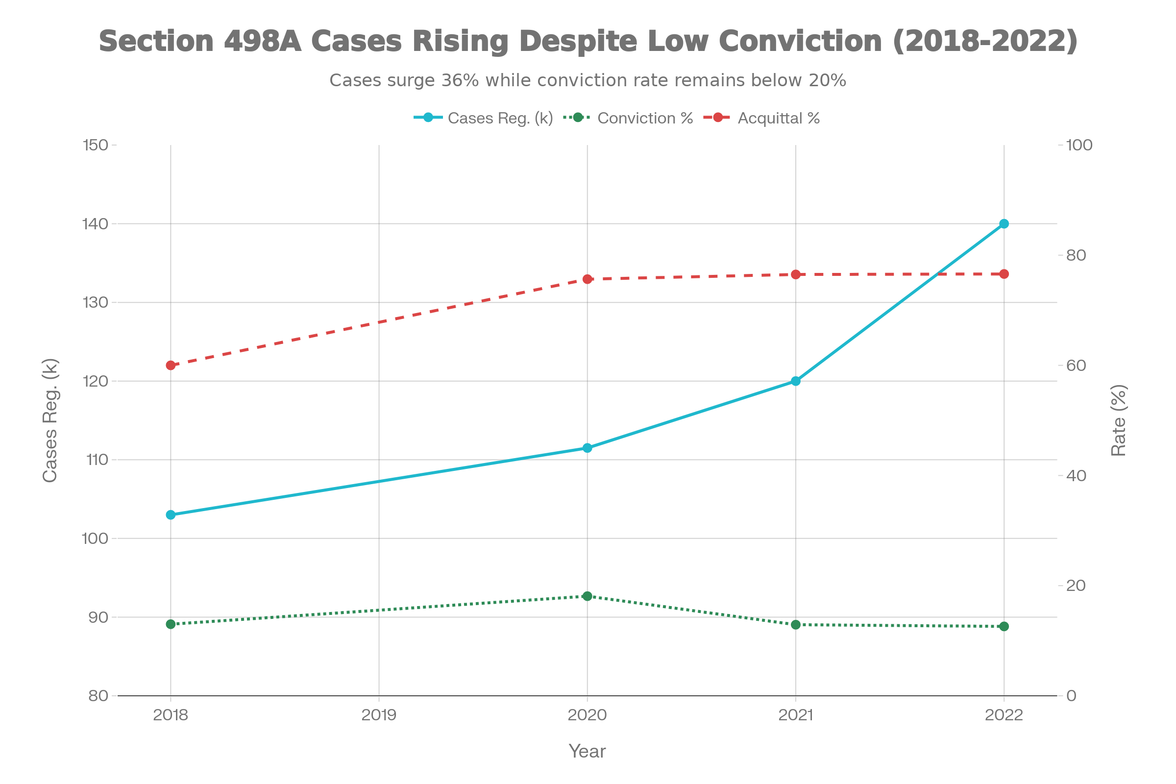 Section 498A: The Growing Data ParadoxFrom 2018-2022, Section 498A cases surged 36%—reaching 1,40,019 in 2022. Yet conviction rates dropped to 12.60%, while acquittals hit 76.59%. Over 788,253 cases remain pending (92%), with 28.71% disposed through