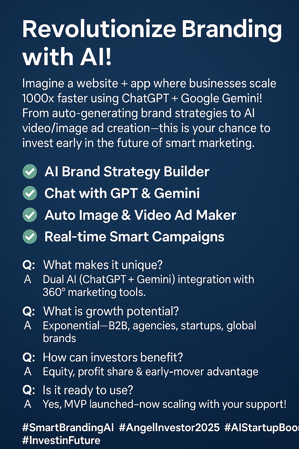 🚀 Shivam Chaturvedi created a Impossible Dream come true for Every Startup that can build a Brand with this Revolutionize Branding with AI! Imagine a website + app where businesses scale 1000x faster using ChatGPT + Google Gemini! From auto-genera