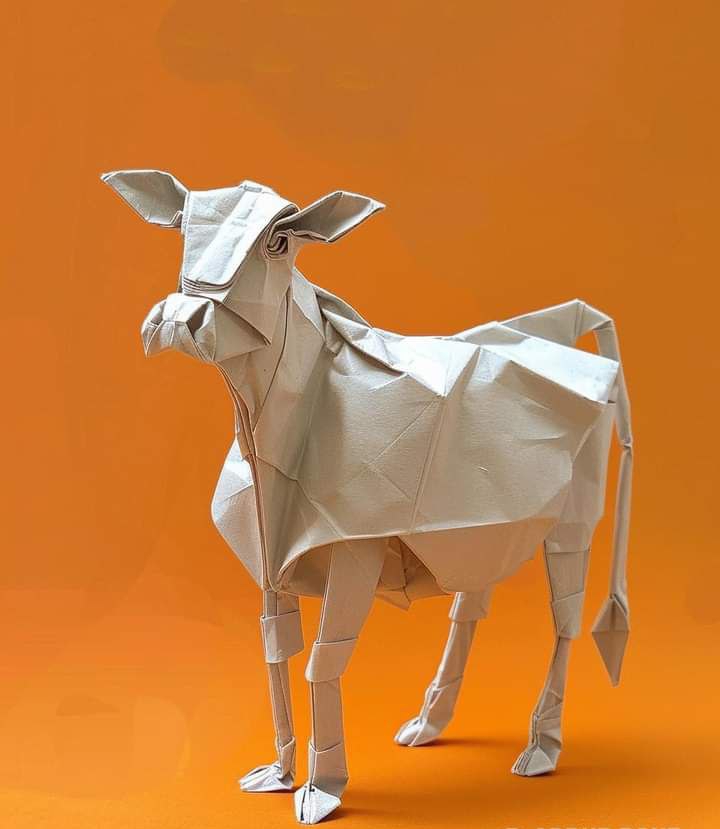 The cow post design that was ai generated. See share your thoughts 🤔 Prompt: A simple origami cow on an orange background, created with paper folded in various shapes to form the animal's body and tail. The cow is standing upright, showcasing its muscular build. It has two large ears pointing upwards, The eyes appear expressive through the folds of the skin. details.