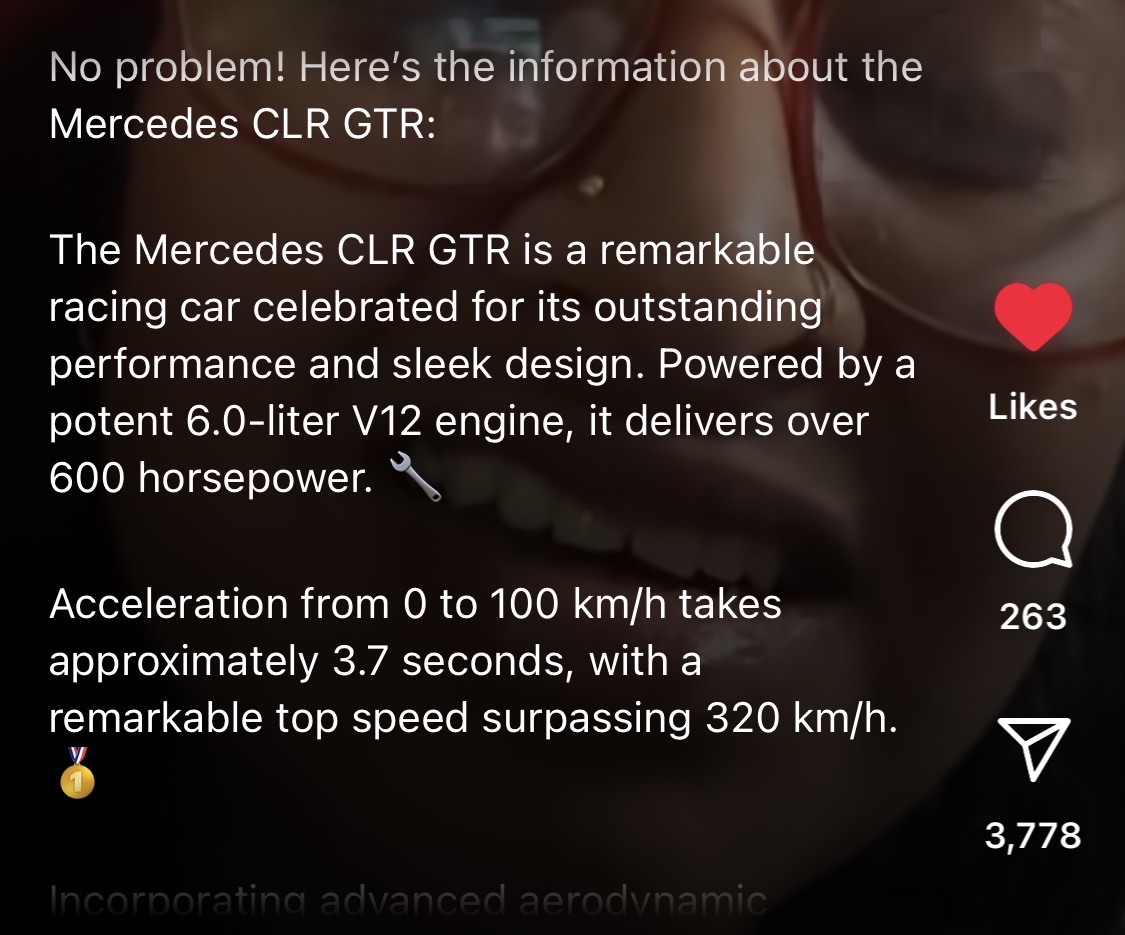 No problem! Here is the information about Mercedes clr!!!! Got frustrated by reading this sentence several times in Insta captions right? Let's talk about this and judge a marketing strategy Real reason: This caption was used by creators to gain reach, as per the algorithm the reels that have lenghtier captions get more views, whilst some creators simply hopped on bandwagon. Marketing strategy: Due to these captions being present all over Instagram now we all know what a Mercedes clr is, and some might even remember the specs. Mercedes doesn't require this level of marketing but it might be helpful to a person holding a small business. The post is being continued in the replies section👇
