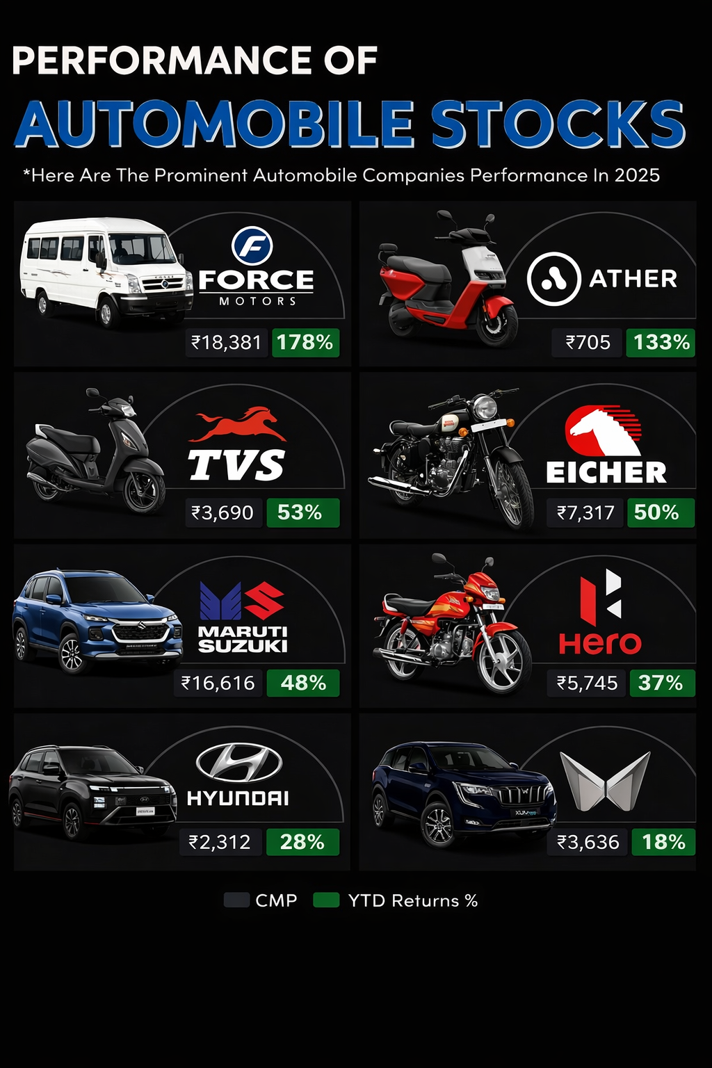 Automobile Stocks Performance in 2025! From Force Motors to Ather Energy, the automobile sector has delivered impressive returns this year 🔥 ✅ Top YTD Performers: 🚐 Force Motors – 178% 🛵 Ather Energy – 133% 🏍 TVS Motor – 53% 🏍 Eicher Motors –