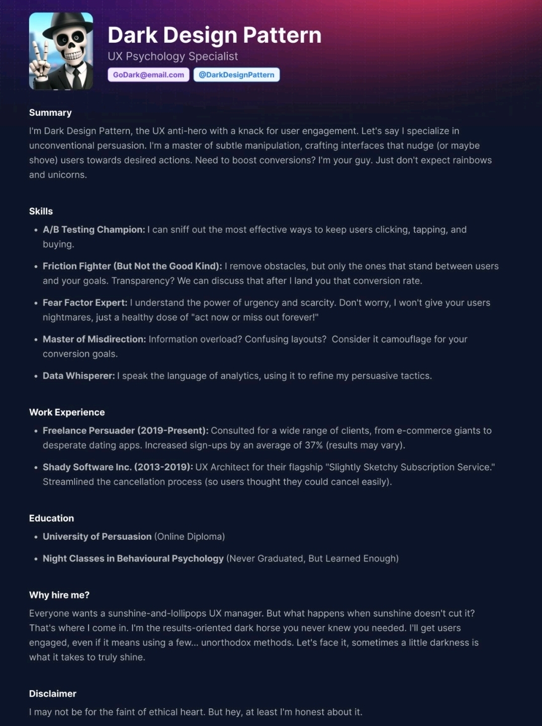 👋 Hi, while searching for some inspiration I stumbled upon something interesting today – the resume of Mr. Dark Design Pattern (DDP) It's definitely unconventional. "Master of Misdirection" and "Fear Factor Expert" certainly aren't on your typical