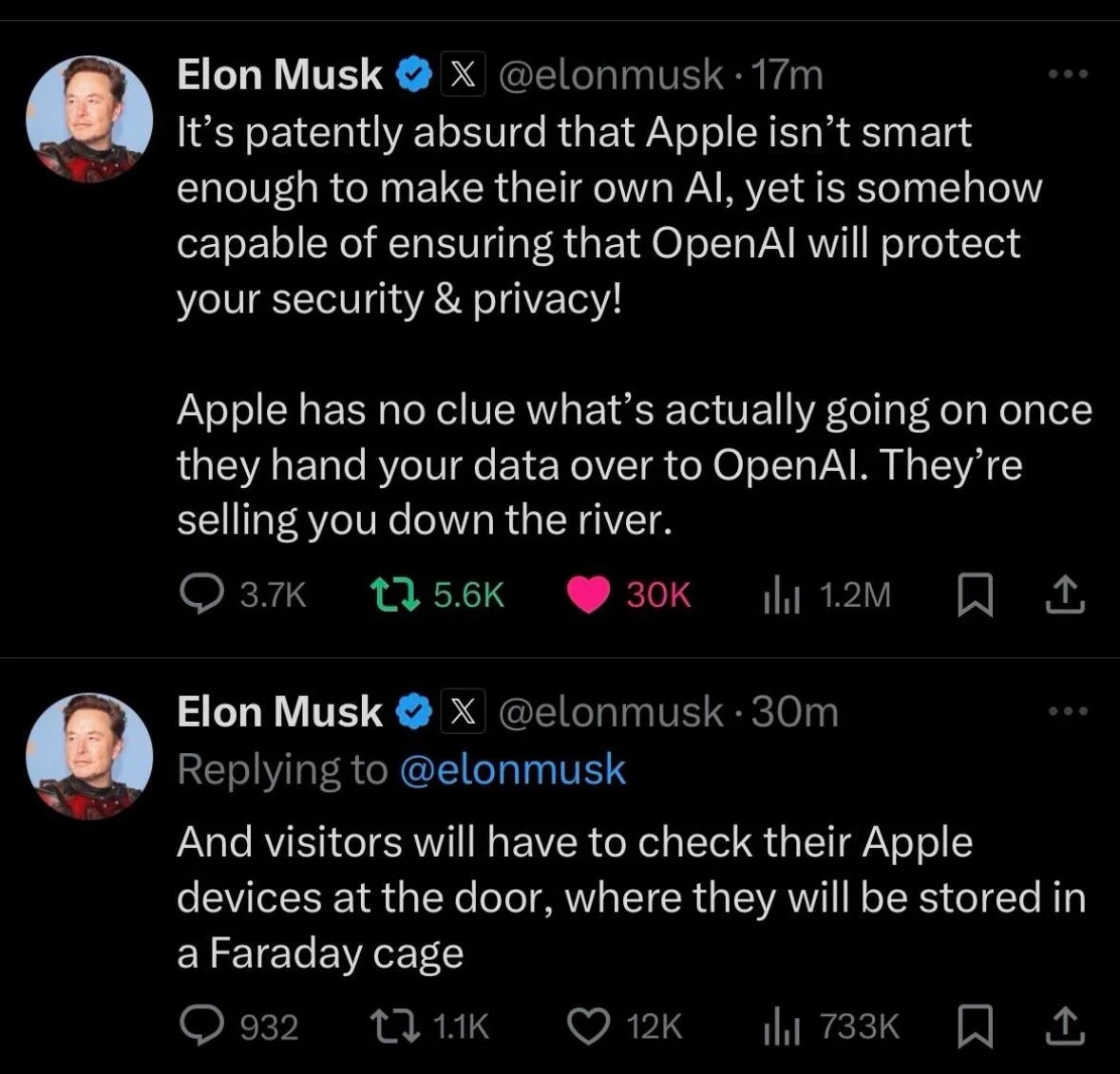What are your opinions on Elon Musk's recent tweets regarding the Apple event? I'm also quite surprised that Apple doesn't seem to have their own artificial intelligence model.
