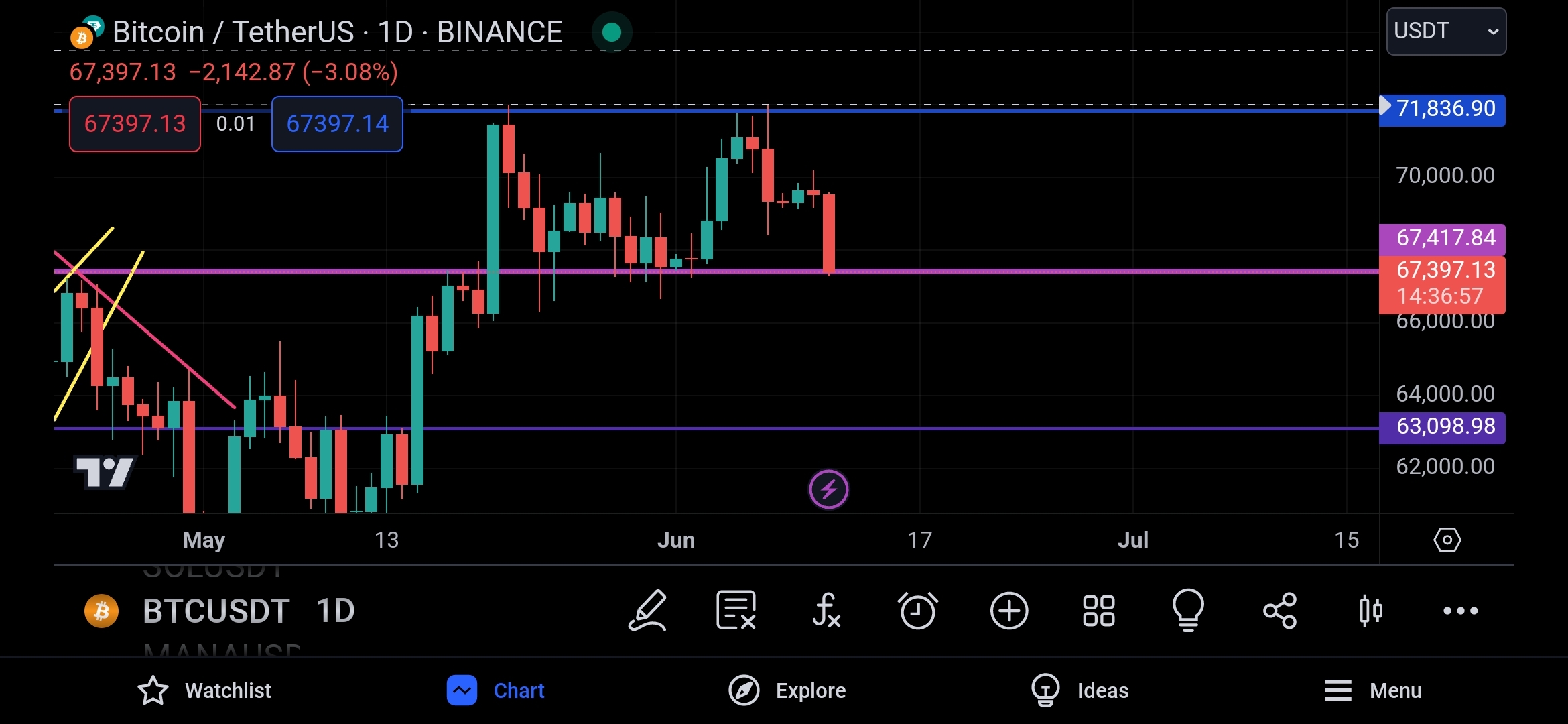 This is not good at all for BTC if it croses my support then it is going down one can easily earn by shorting also i had a long position opened at 69.5k which was supposed to be in 200% profit it BTC had broke resistance but its ok happens in market