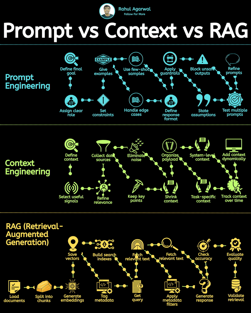 Prompt vs Context vs RAG. I've explained it in a simple way below. 1. ๐ฃ๐ฟ๐ผ๐บ๐ฝ๐ ๐๐ป๐ด๐ถ๐ป๐ฒ๐ฒ๐ฟ๐ถ๐ป๐ด Prompt Engineering is about ๐ฐ๐น๐ฒ๐ฎ๐ฟ ๐ถ๐ป๐๐๐ฟ๐๐ฐ๐๐ถ๐ผ๐ป๐, not magic words. โข ๐๐ฒ๐ณ๐ถ๐ป๐ฒ ๐๐ต๐ฒ ๐ณ๐ถ๐ป๐ฎ๐น ๐ด๐ผ๐ฎ๐น: What exactly do
