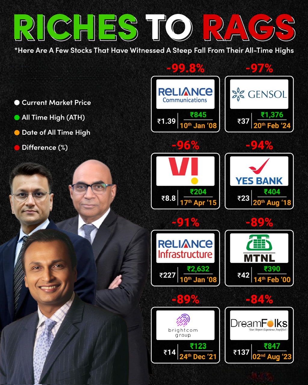 RICHES TO RAGS! Here are a few Indian stocks that once ruled the markets โ but have now fallen by over 80โ99%! From Reliance Communications and Yes Bank to Vodafone Idea, MTNL, and DreamFolks โ these are the biggest stock market crashes in Indian