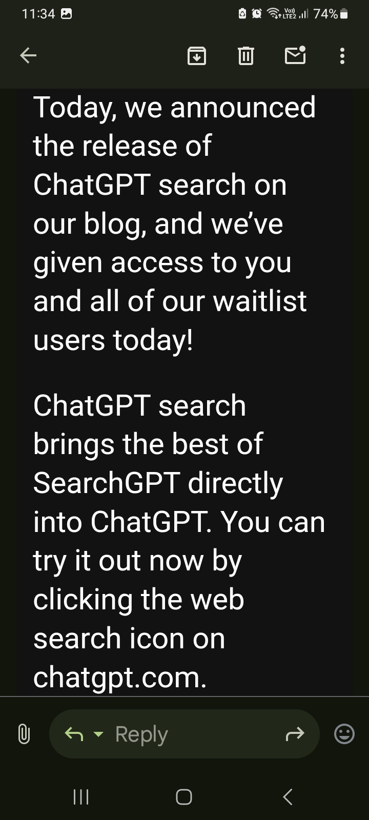 ๐ Exciting news! ๐ I'm thrilled to share that Iโve been granted access to the new ChatGPT Search! OpenAI has just announced the release of this feature, and it's now available for all waitlist users. With ChatGPT Search, the power of web search i