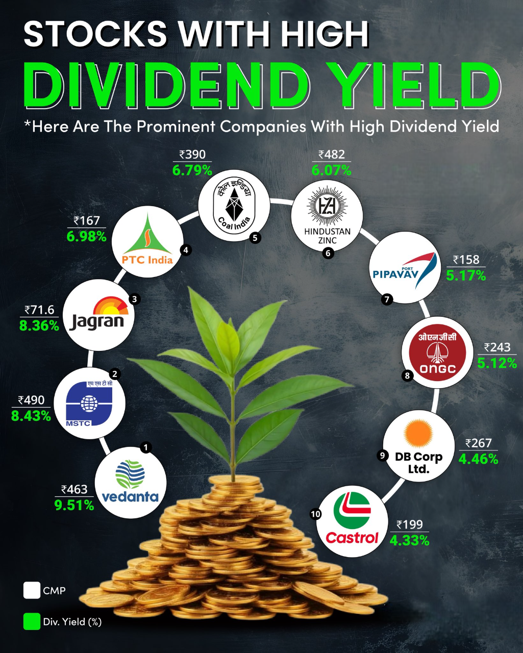 Top 10 Dividend Paying Stocks in India! Want to earn steady passive income while investing? These stocks are giving high dividend yields in 2025 📊 Top Picks: 1️⃣ Vedanta – 9.51% 2️⃣ MSTC – 8.43% 3️⃣ Jagran – 8.36% 4️⃣ PTC India – 6.98% 5️⃣ Coal