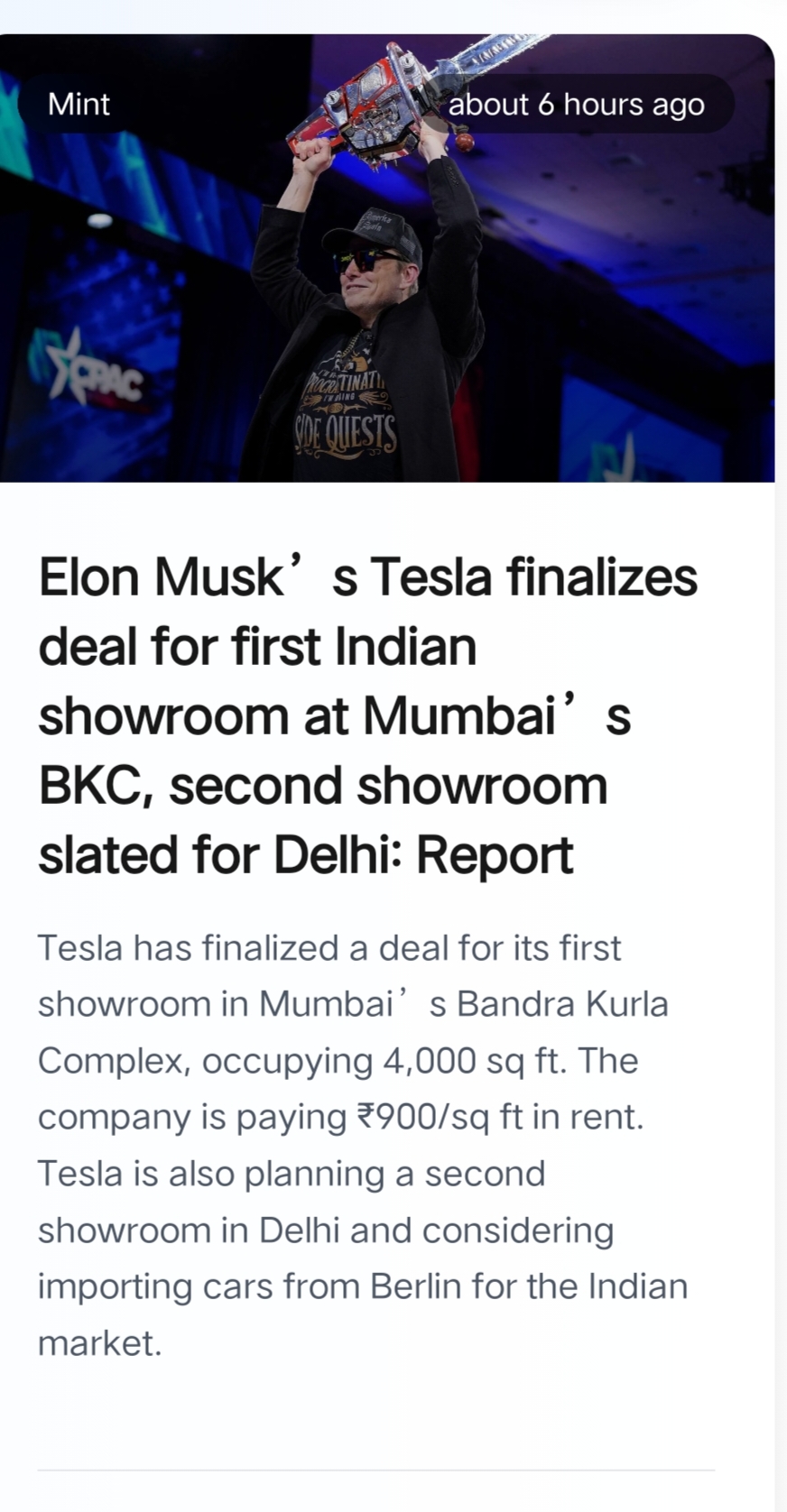 Tesla has finalized its first Indian showroom in Mumbai’s Bandra Kurla Complex, spanning 4,000 sq ft, with a rental rate of ₹900/sq ft. A second showroom is planned for Delhi, and Tesla is considering importing cars from Berlin for the Indian market.