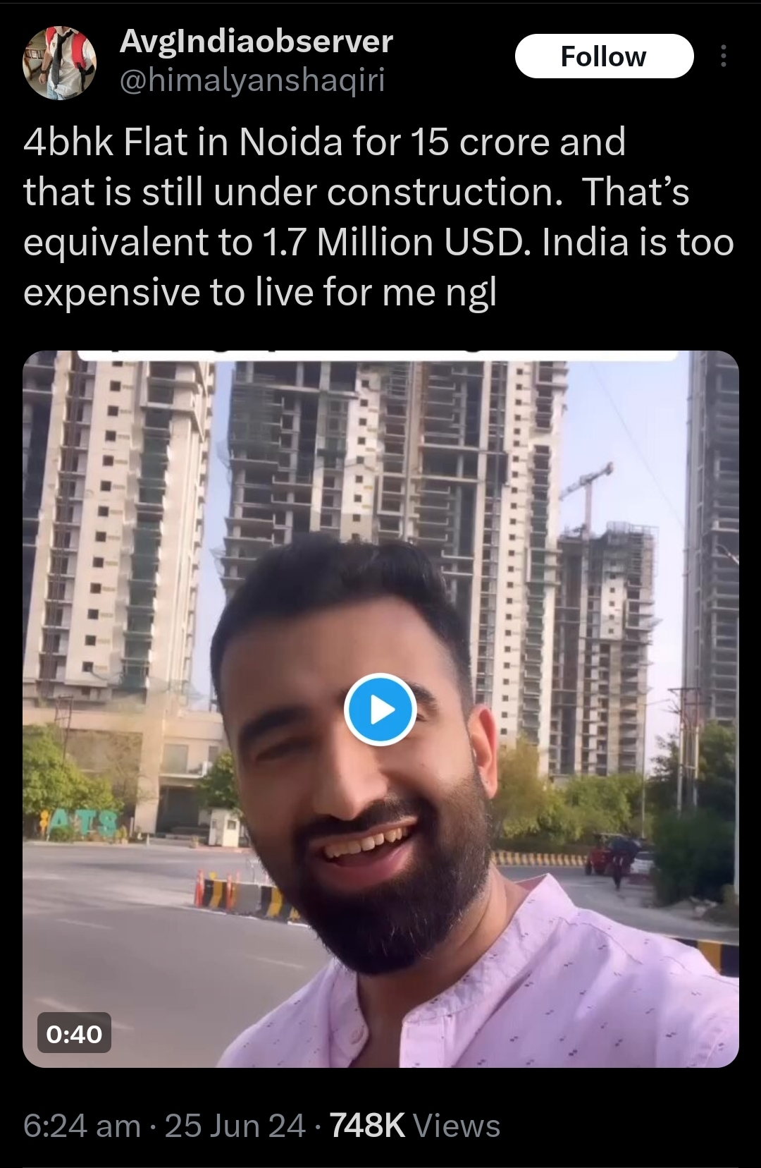 15 Crores ($1.7 Million) for a 4 BHK flat in Noida, UP. That's insanely overpriced. Does India's Real Estate market is in a Bubble? For this kind of money you can buy a property in a decent location in Dubai or Singapore. Tweet Link: https://x.com/