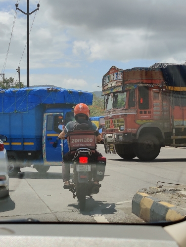 Guy wearing swiggy helmet and bag of Zomato, it's sad and funny at the same time. Maybe in future he'll deliver Zepto orders.