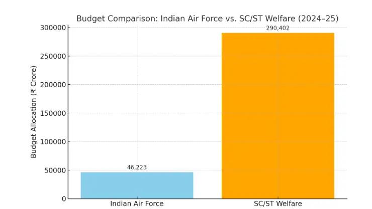 Budgets of DRDO + ISRO: โข DRDO: โน23,855 cr โข ISRO: โน13,042.75 cr Total: โน36,897.75 cr Budgets for SC, ST and Minority Affairs: โขSC: โน1,65,493 cr โขST: โน1,24,909 cr โขMinistry of Minority Affairs: โน3,183.24 cr Total: โน2,93,585.24 cr That is called