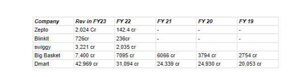 It took 2/3 years for quick commerce players to get to their first 2000 crore in revenue, and Big Basket took 5/6 years to reach there. Dmart took around 9/10 years to reach revenue of 2000 crore. Zepto & Blinkit are on their way to do 2x in reve