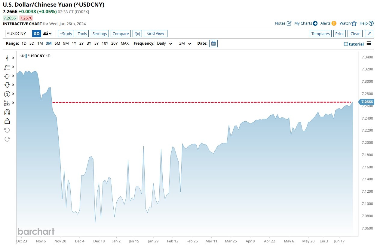 Chinese Yuan falls to lowest level against the U.S. Dollar in more than 7 months