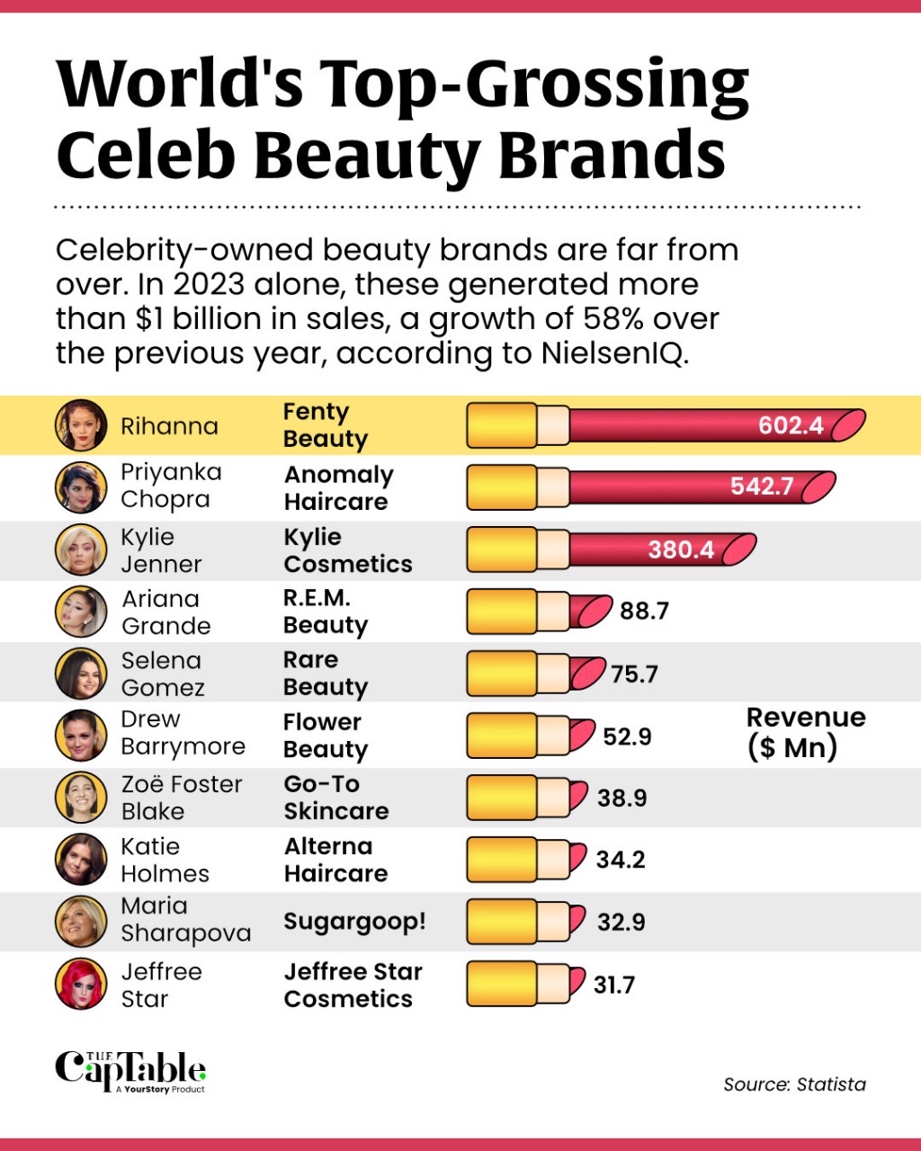 Globally, Priyanka Chopra's haircare brand Anomaly emerged as the 2nd highest-grossing celeb beauty brand in 2023, clocking $543 Mn in sales 💸 Only rihanna's Fenty Beauty was bigger in annual revenues.