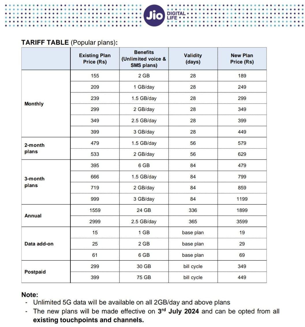 A day after the spectrum auctions, Akash Ambani-led Reliance Jio has taken the lead in hiking mobile service tariffs. The company announced tariff hikes ranging from 12.5% to 25% across most of its plans, effective from July 3, 2024. Jioโs lowest