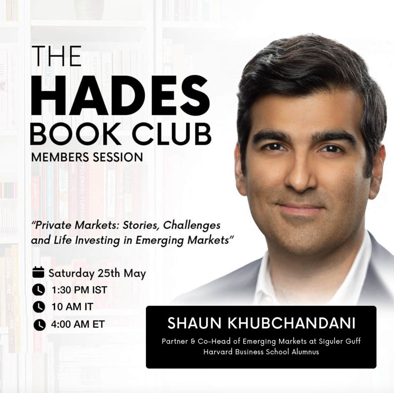 Join us for The Hades Book Club's inaugural fireside chat with Shaun Khubchandani: Exploring Emerging Markets A key objective when convening The Hades Book Club was to bring together top finance professionals from across the globe to interact with o