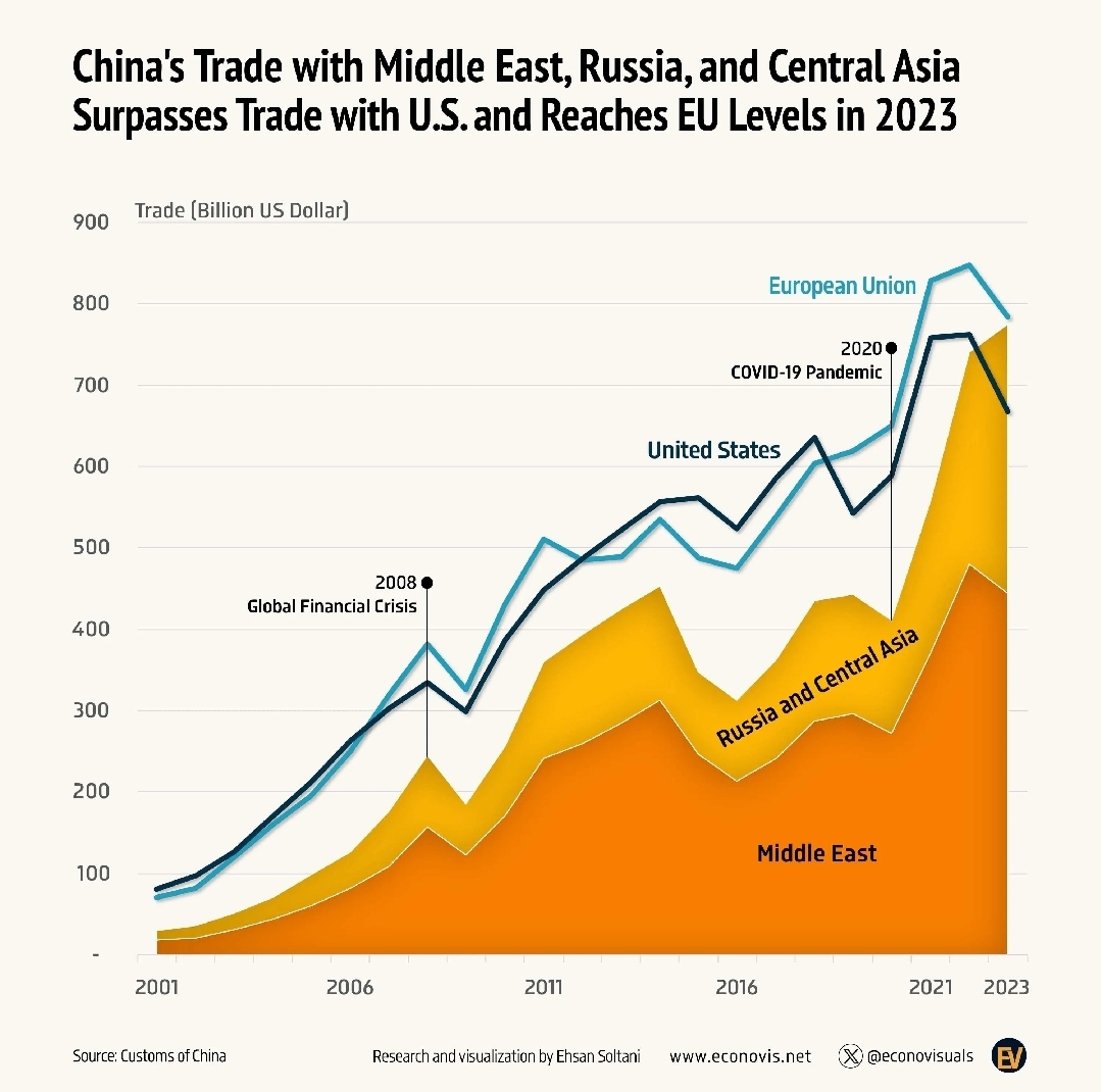 China's Trade with Middle East, Russia, and Central Asia Surpasses Trade with US and Reaches EU Levels in 2023. It shows Middle Eastern and Central Asian Countries shift from West towards China.