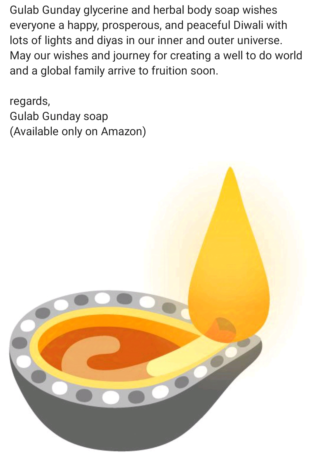 Gulab Gunday glycerine and herbal soap wishes everyone a happy, prosperous and peaceful Diwali with lots of lights and diyas in our inner and outer universe. May our wishes and journey for creating a well to do world and a global family arrive to fru