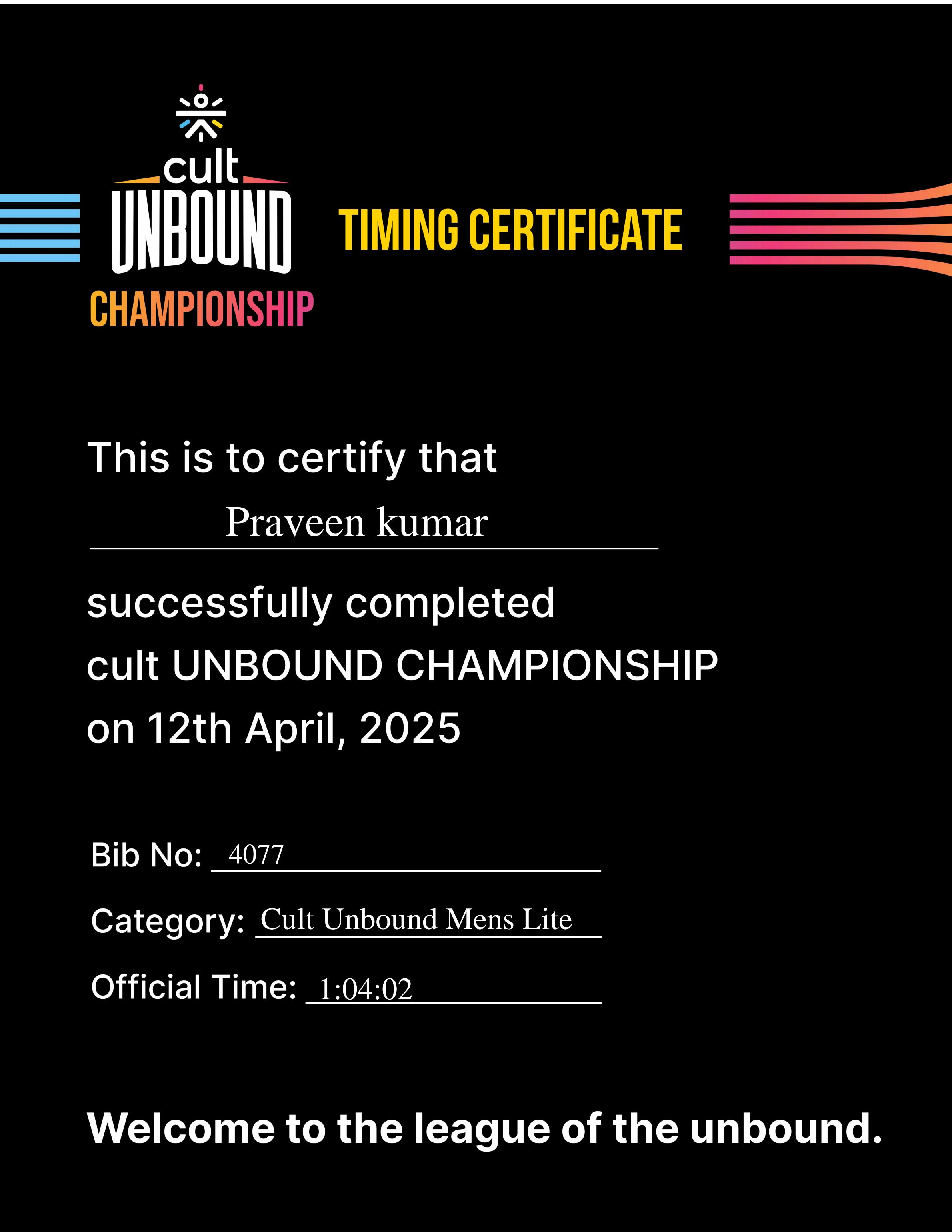Cult Unbound Finisher! ๐ Completed the Cult Unbound Championship (Mens Lite) in 1:04:02 on April 12, 2025. Fueled by passion, grit โ and supported by #MuscleBlaze, #LiquidIV, and #Adidas. This is just the beginning. #Finisher #FitnessMilestone #Cul