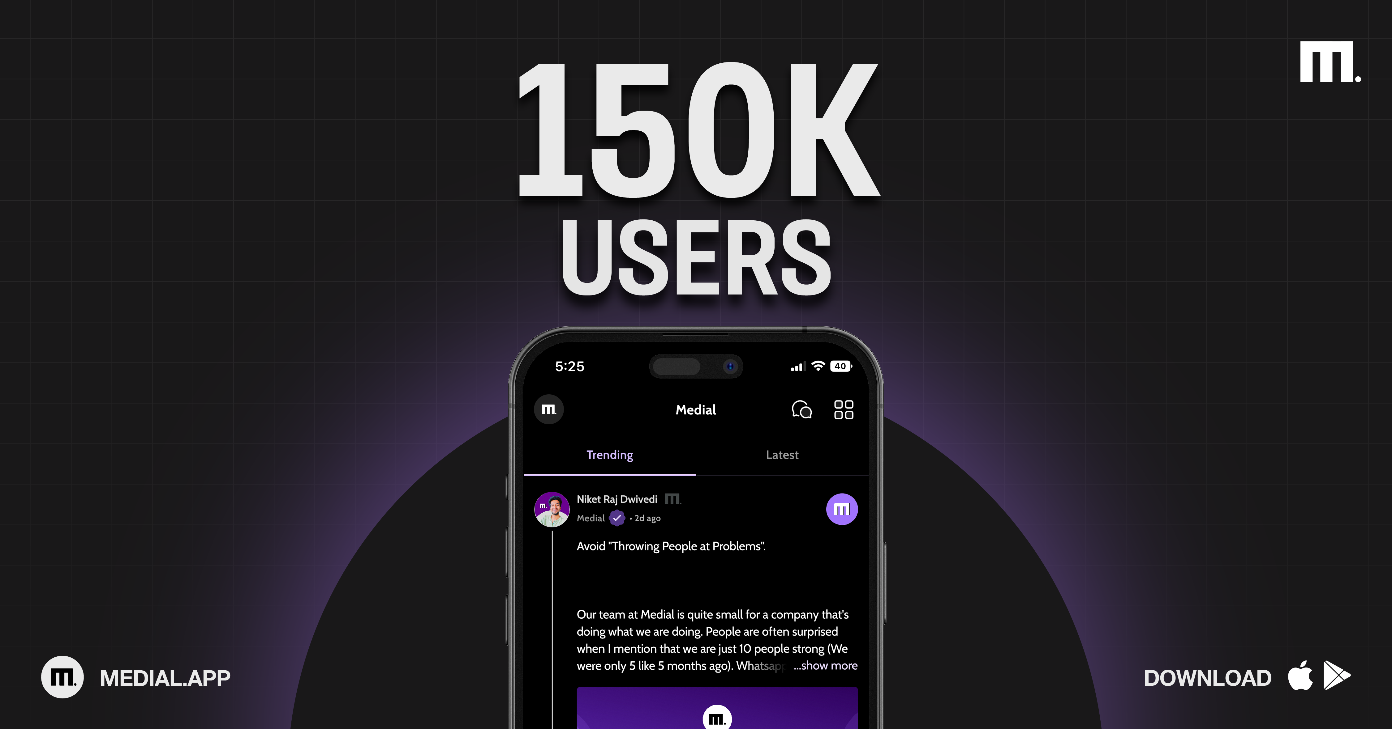 150k Professionals on Medial now! What a way to start the new year! 0-100k in 9 months and another 50k in a single month! Next stop is 1M users! Thank you everyone for loving Medial and our efforts for creating the future of professional networking