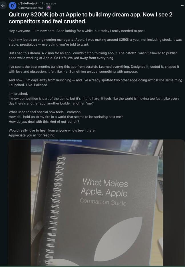 This guy quits his $200k job at Apple to build his dream app and then gets UPSET that 2 apps are competing with him!! THE REALITY: in the AI age, 100 apps will do what yours does. 17 things your app actually needs to win these days: 1. build audi