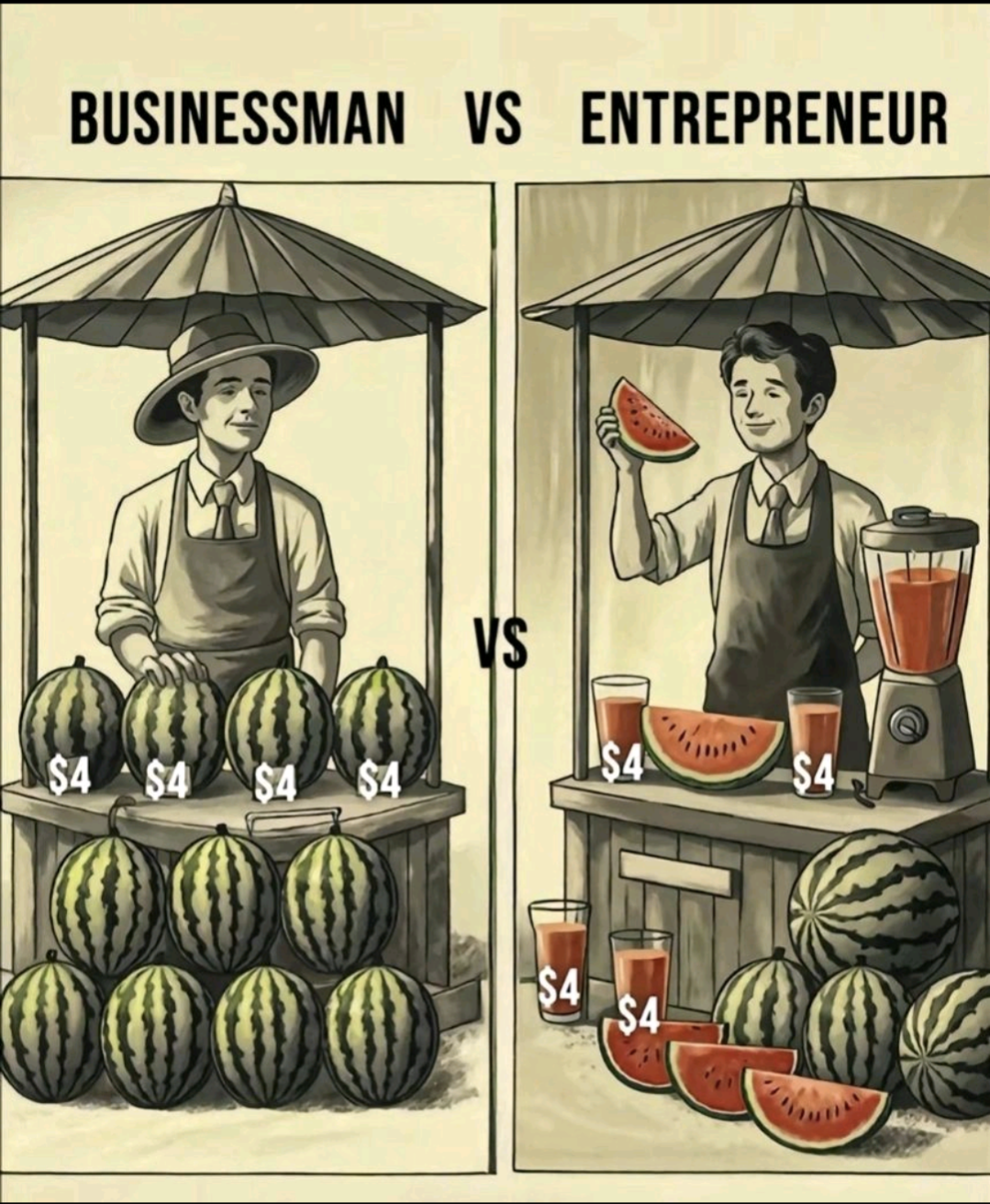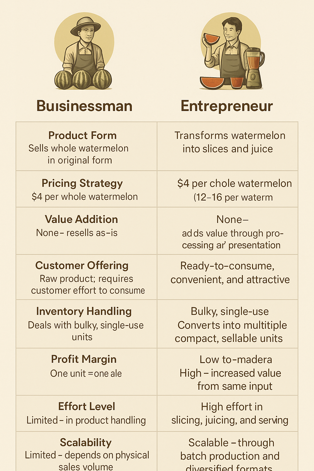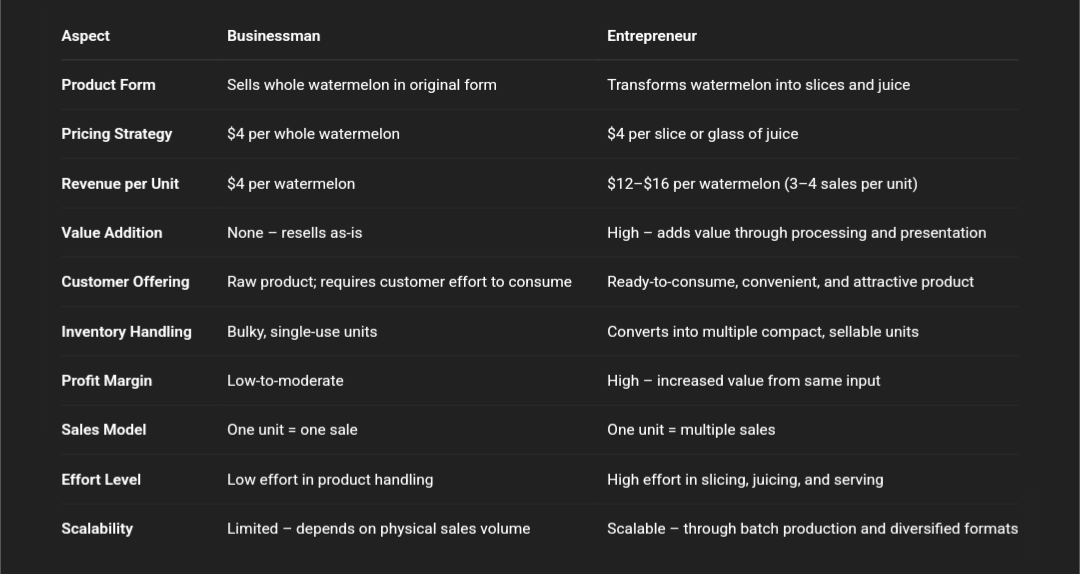 ๐๐๐๐ถ๐ป๐ฒ๐๐๐บ๐ฎ๐ป ๐ฉ๐ ๐๐ป๐๐ฟ๐ฒ๐ฝ๐ฟ๐ฒ๐ป๐ฒ๐๐ฟ : ๐๐๐๐ถ๐ป๐ฒ๐๐๐บ๐ฎ๐ป : Product Form: Sells whole watermelons in their raw, original state. Pricing Strategy: Fixed price of $4 per watermelon. Revenue per Unit: Earns only $4 per watermelon