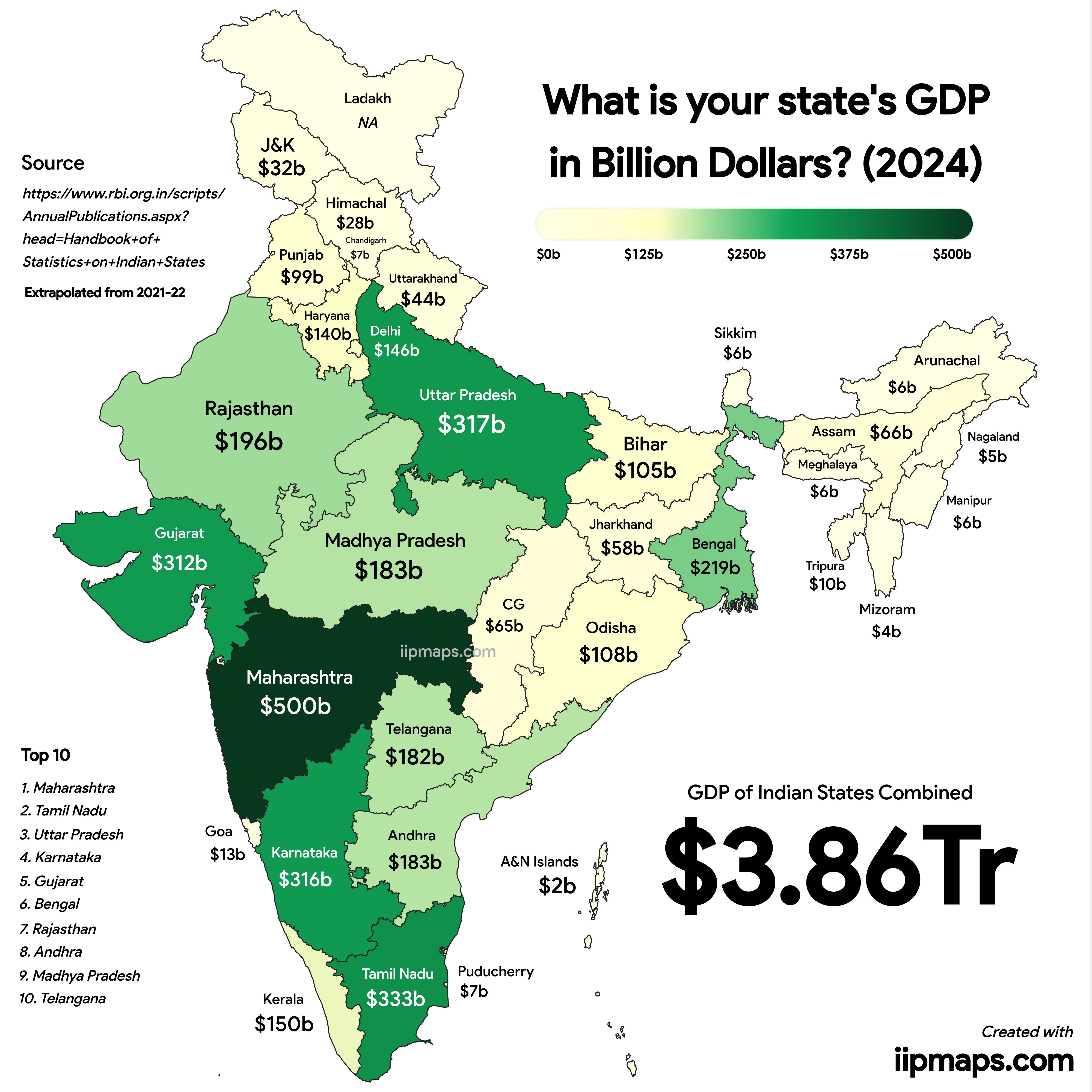 GDP of Indian States. Maharashtra is the first Indian State to hit $500 Billion GSDP.