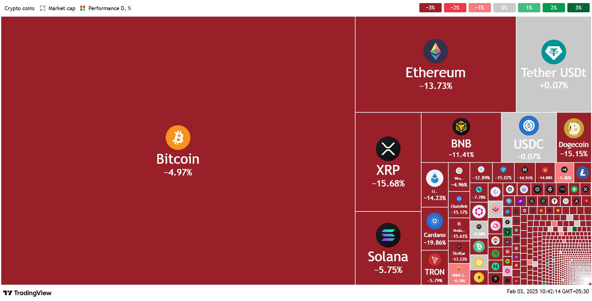 US stock market futures tumbled following President Donald Trump's announcement of new trade tariffs on China, Mexico, and Canada. Meanwhile, the crypto market saw a sharp decline, losing around $341 billion in the last 24 hours. Market volatility