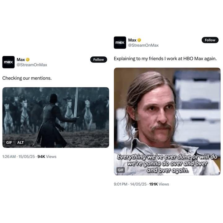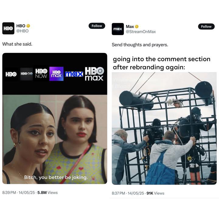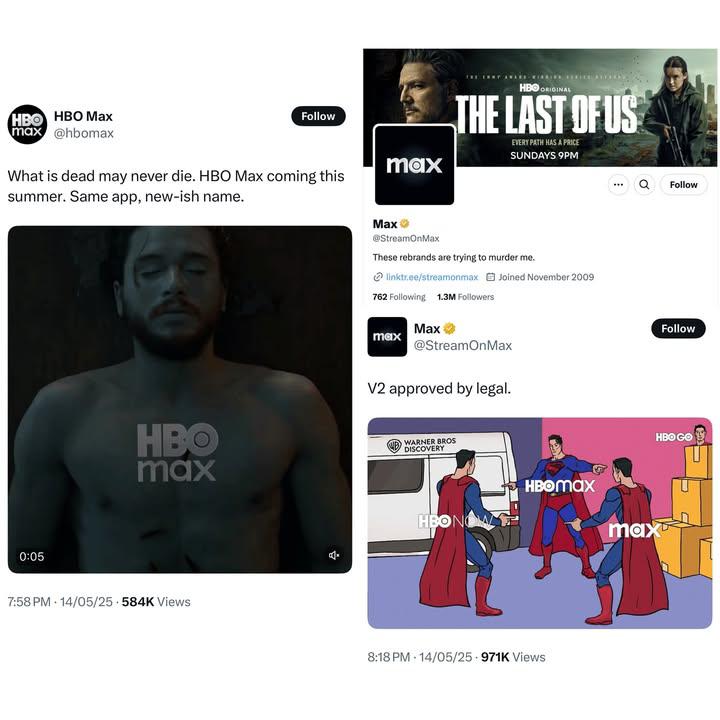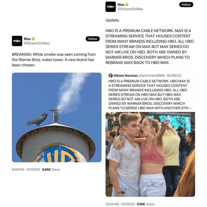 Ah, the never-ending saga of streaming service name changes! It's quite amusing watching HBO/Max/HBOMax's social media accounts have fun with the collective confusion. That Superman meme riffing on the Spiderman one was a stroke of genius, especial