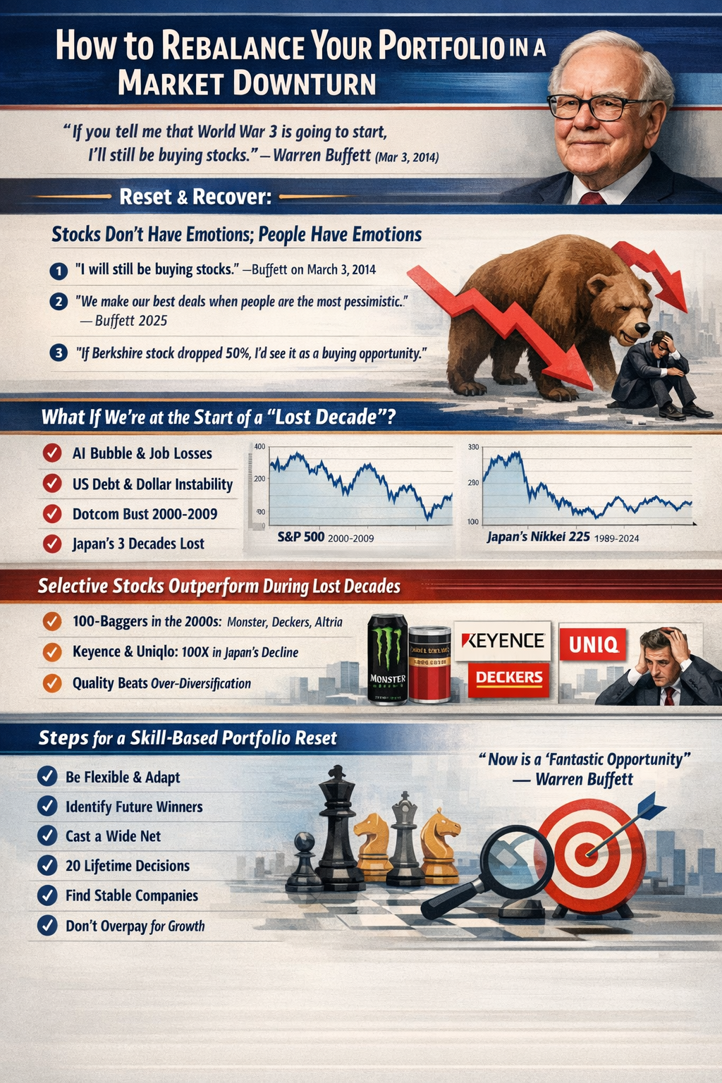 How to Rebalance Your Portfolio in a Market Downturn 1. "If you tell me that World War 3 is going to start, I'll still be buying stocks." – Warren Buffett (Mar 3, 2014) 2. Your stock doesn't care about war or peace; it cares about future earnings