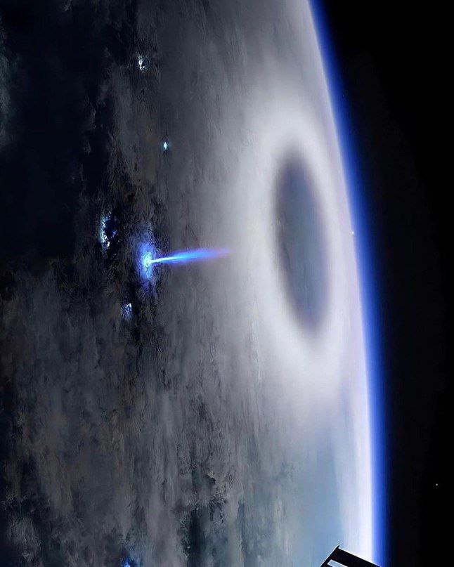 Lightning that strikes vertically upwards from a thundercloud at the boundary of the atmosphere and space. The photo was taken from the ISS.