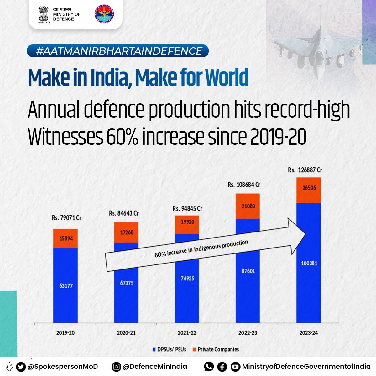 🇮🇳| India's defence production. -India's indigenous defence production rose to 1.27 lakh crore as per the data received all from the DPSU, PSU and private sector. -A growth of 16.7% has been observed when compared to last year. -The total value of production in 2023-24, 79.2% came from DPSU and PSU and 20.8% by private sector. (DPSU: Defence Public Sector Undertakings)