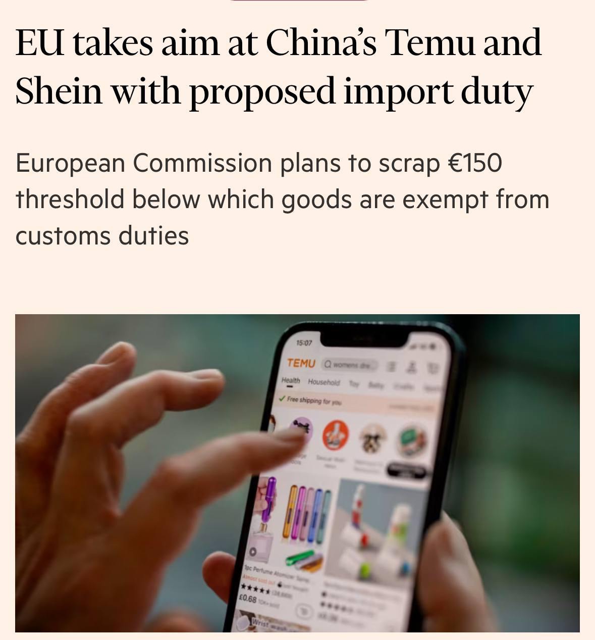 🗣 The EU plans to reinstate tariffs on cheap goods purchased from Chinese platforms AliExpress, Temu, and Shein – FT. 🇪🇺📦 At the end of July, they plan to eliminate the €150 threshold below which goods are exempt from tariffs. 📉💶