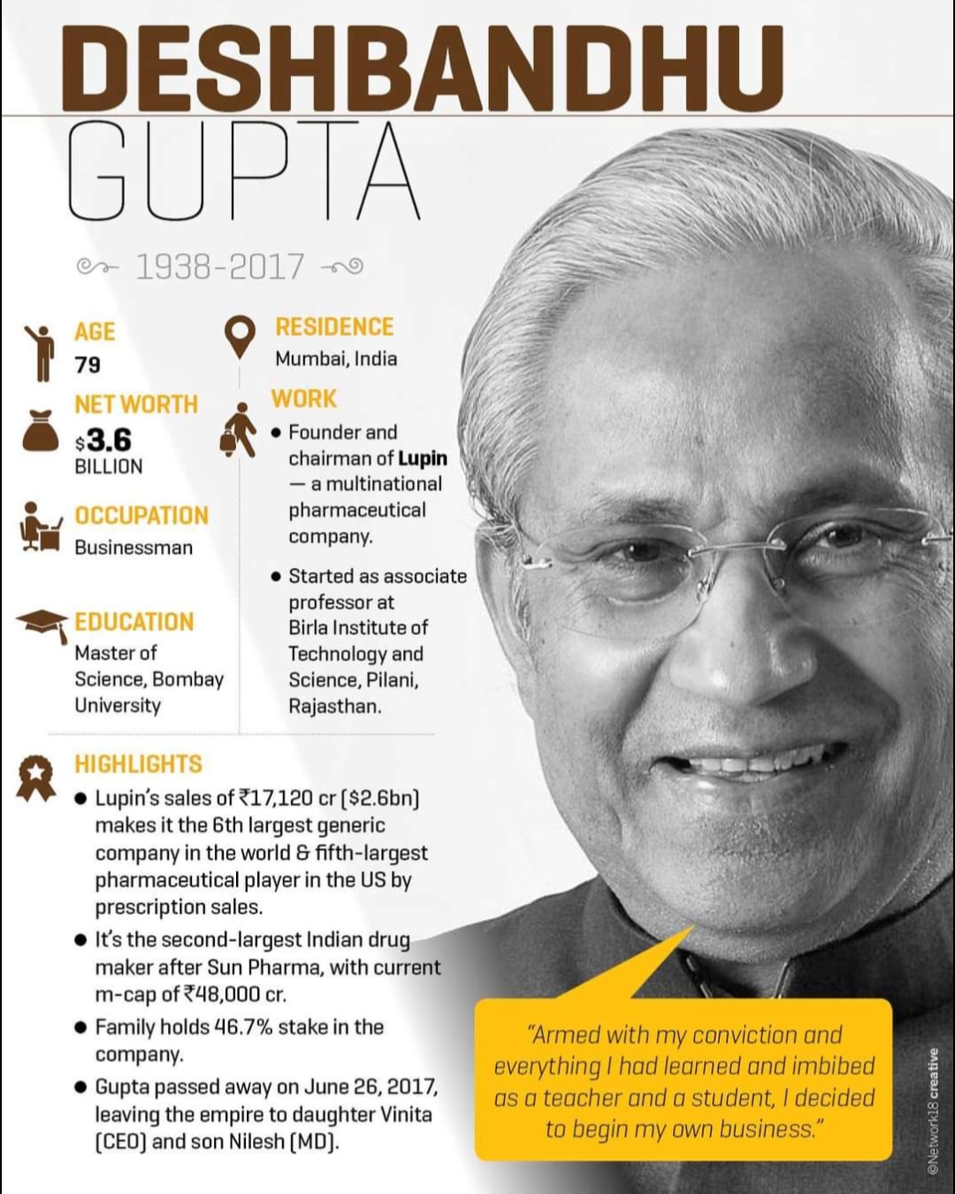 Imagine a teacher at a college who not only teaches but also inspires his students to think creatively. Mr. Gupta, a former chemistry teacher, did just that. He nurtured his entrepreneurial spirit and planted the seeds of a business that grew into a successful company called Lupin Ltd. This company has now become one of the top 10 largest companies in the world, worth $10 billion. Just like the branches of a tree spread out. Lupin Ltd. has expanded its presence worldwide, becoming the 4th largest maker of generic drugs. It's as if Mr. Gupta's teachings have taken root and thrived, making Lupin Ltd. A strong force in the pharmaceutical industry, like a big tree in the business world.