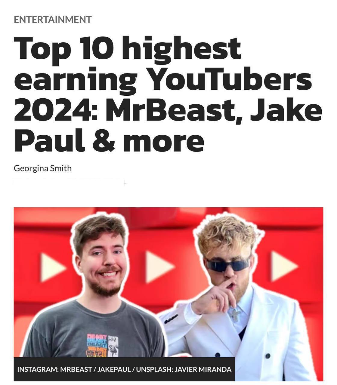 ๐ฆ Top 10 Highest-Paid YouTube Bloggers in the World ๐ ๐ธ Data gathered from various sources; income is for the past year 1. MrBeast - $85M ๐ฐ 2. Dhar Mann - $45M ๐ผ 3. Jake Paul - $45M ๐ฅ 4. Markiplier - $38M ๐ฎ 5. Rhett & Link - $3