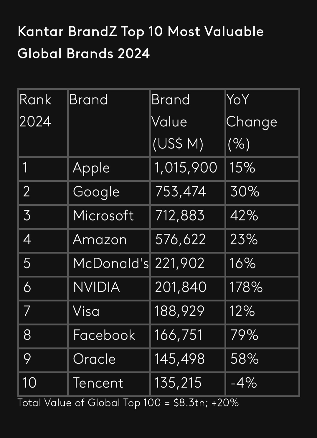 Apple has become the world's FIRST trillion dollar brand !!!! Also look at the brand value gained by Nvidia! 🤯