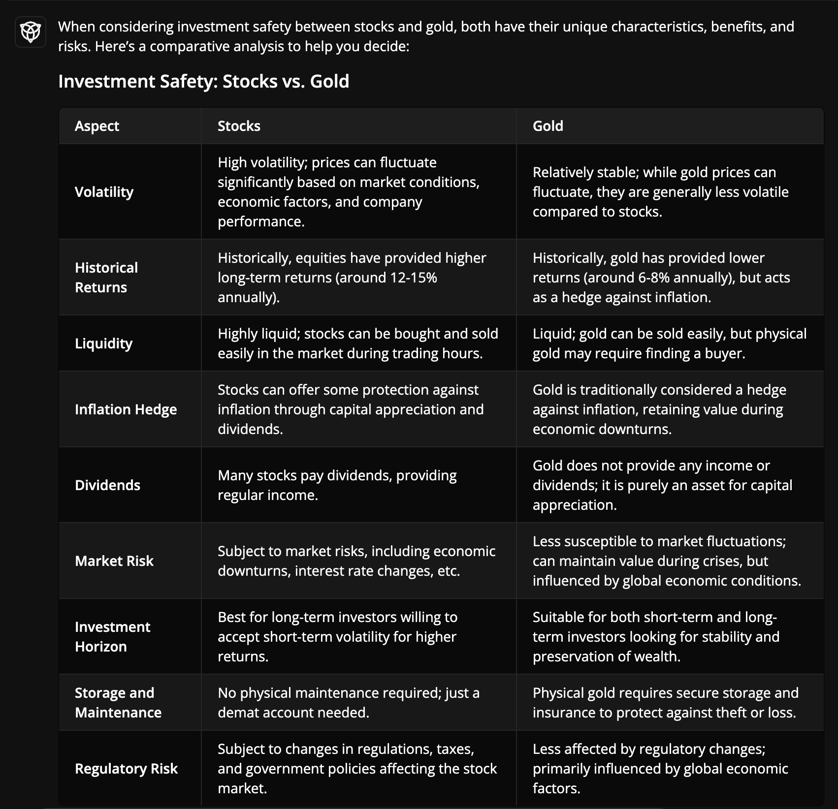 Gold or Stocks: Which is the better investment? ๐ค To make it simple, Finstreets' AI has prepared an easy to understand comparison table highlighting key aspects like: 1๏ธโฃ Volatility: Stocks have high fluctuation, while gold is more stable. 2๏ธโฃ Retur