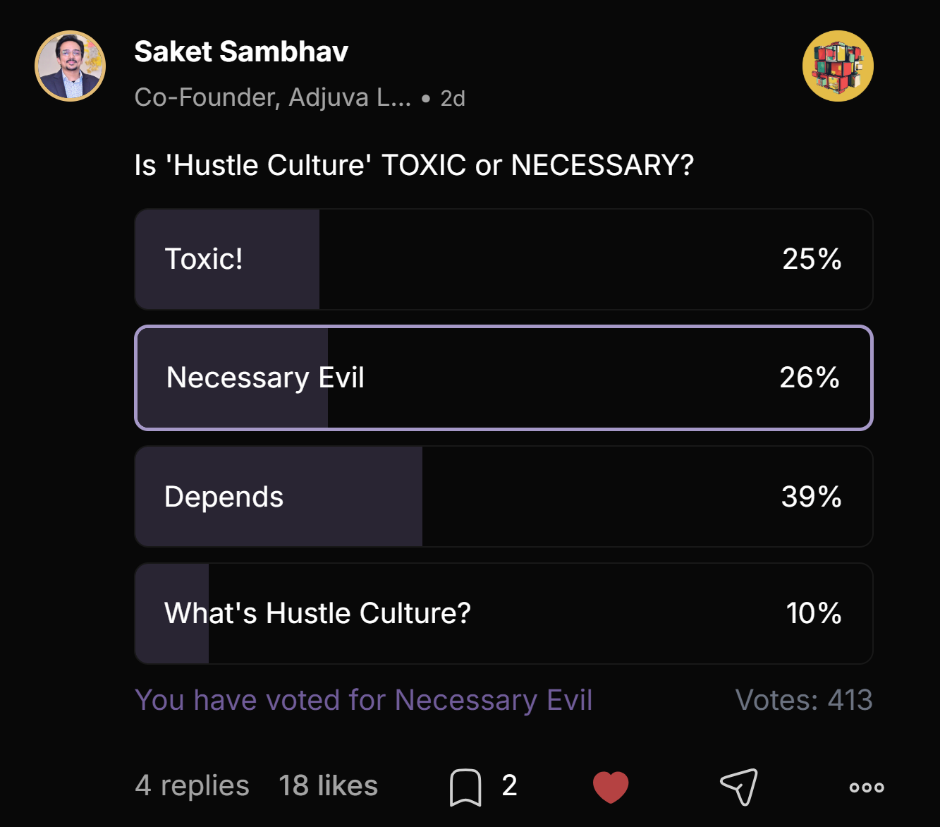 Poll Results Are In! Is 'Hustle Culture' Toxic or Necessary? ๐ค 400+ persons voted. Thanks to everyone who participated! Clearly, the traditional "grind at all costs" mindset is being questioned. How do you strike a balance between ambition and wel