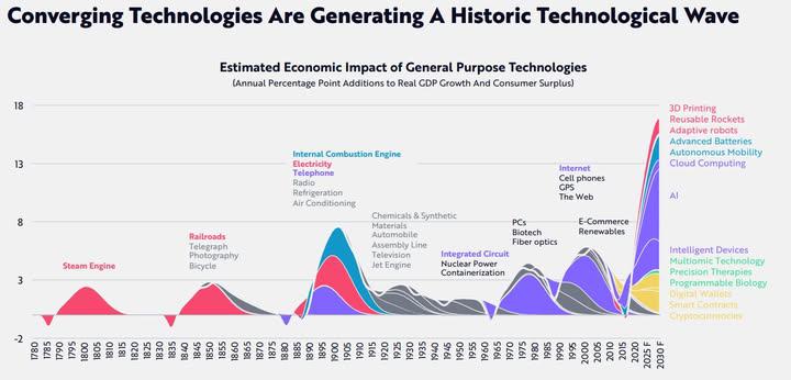 A new wave of technology is rewriting the playbook 🌊 ARK Invest’s Big Ideas report shows how converging innovations—from AI to advanced batteries—are driving a historic surge in economic impact. What’s different now? The speed and convergence of t