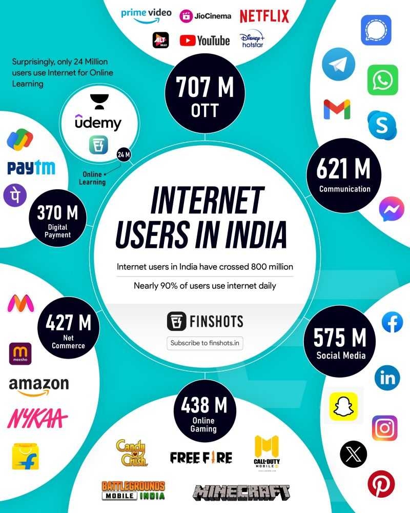 800 million Indians use the internet, but less than 3% use it for educational purposes. Majority Indians use the Internet for OTT, Social Media, Gaming, etc. Hope we can shift our focus from entertainment to education soon...