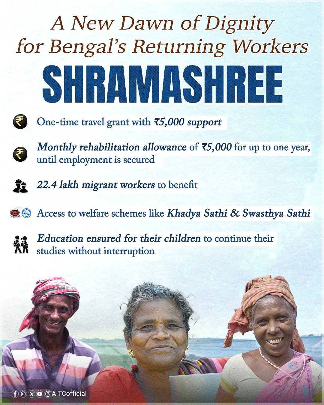West Bengal has launched a revolutionary program—the Shramashree Scheme—to support Bengali migrant workers coming back to the state. Under this scheme, workers will receive financial aid, food security, health care coverage, skill training, job card
